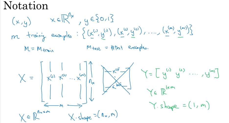 - \((x,y) \quad x\in \mathbb{R}^{nx}, y\in \left\{ 0,1\right\}\): 한 개의 sample (example)을 의미
