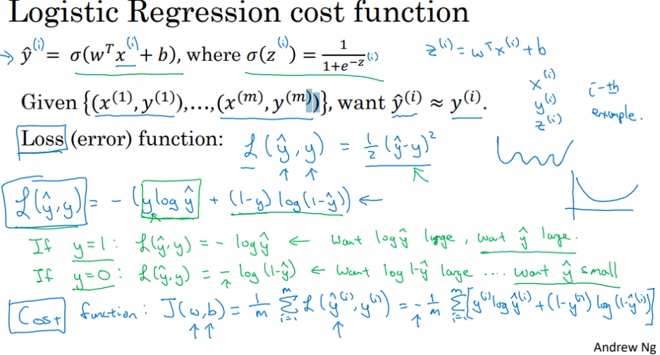 $$L(\hat{y}, y)=-(ylog\hat{y}+(1-y)log(1-\hat{y}))$$