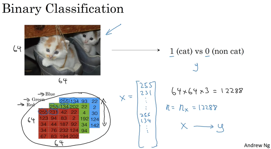 이를 위해, 컴퓨터는 입력된 이미지 데이터를 픽셀(pixel)별로 처리 가능한 RGB 형태로 변환하여 인식합니다. 예를 들어, 입력된 고양이 이미지가 \(64px \times 64px\)이라면, 동일한 크기를 갖는 Red, Green, Blue 3개로 분리된 행렬을 사용합니다. 각 픽셀에 적혀있는 숫자는 채도를 의미하며, Red, Green, Blue의 채도가 어떻게 합쳐지느냐에 따라 모든 색은 표현 가능합니다. 이렇게 Red, Green, Blue의 값들을 하나의 feature vector \(x\)에 나열해보면, \(64 \times 64 \times 3\)의 차원(dimension)으로 나타낼 수 있습니다.